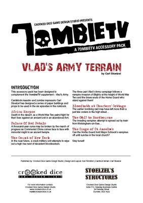 Vlad’s Army brings Vampire casts to your games of 7ombieTV and this 49 page PDF contains cardstock terrain to build as designed by Carl Stoelzel. You can defend war-ravaged Britain during the vampire invasion of Walsingham-on-Sea, rage across the African desert or fight amongst ancient Chinese temples with this excellent accessory pack.